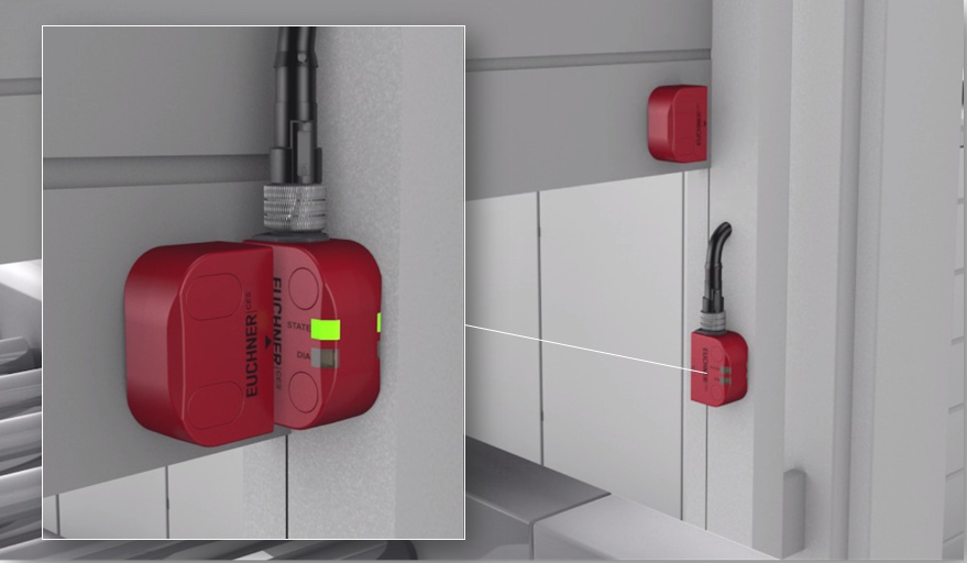 Normalmente, los interruptores de seguridad o las cabezas de lectura se colocan en la parte fija, mientras que los actuadores van montados en la parte móvil del resguardo. Al cerrar la puerta, el actuador se aproxima al interruptor de seguridad o a la cabeza de lectura. Al llegar a la zona de reacción, la cabeza de lectura lee por inducción los datos del transpondedor en el actuador codificado, y los transmite al sistema electrónico de evaluación. Si los datos transmitidos por el actuador coinciden con los de la memoria, se habilitan las salidas de seguridad.